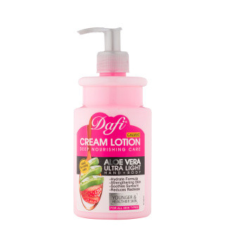 پوست بدن هم مانند پوست صورت به رسیدگی و مراقبت نیاز دارد، برای این کار بعد از استحمام باید از لوسیون مخصوص بدن استفاده کرد. لوسیون بدن به تامین و حفظ رطوبت پوست، جلوگیری از خشکی، رفع قرمزی و خارش پوست، شادابی و لطافت پوست کمک زیادی میکند. بهترین زمان استفاده از لوسیون بدن، بعد از حمام و زمانی است که پوست کاملا خشک نشده و کمی رطوبت دارد. استفاده از لوسیون بدن، نه تنها ضرری ندارد بلکه به هیدراته و مرطوب شدن پوست و افزایش شادابی و طراوت آن کمک شایانی میکند. درصد زیادی از مواد تشکیل دهنده لوسیون بدن از آب است، به همین دلیل روی پوست بدن اصلا حس چربی و سنگینی ایجاد نکرده و در لطافت بیشتر پوست موثر هستند. استفاده از لوسیون برای همه مخصوصا افرادی که پوست خشک و حساس دارند توصیه میشود. این محصول در رطوبت رسانی و رفع خشکی پوست به ویژه قسمتهای خیلی خشک بدن مانند آرنج و زانو بسیار موثر است. استفاده از لوسیون بدن به شفافیت، طراوت، حفظ آرامش، ایجاد حس خوب و بوی خوش روی پوست کمک زیادی میکند. لوسیون بدن مدل توت فرنگی و آلوئه ورا 470 میل دافی پوست را عمیقا آبرسانی کرده و خشکی آن را از بین میبرد. این محصول حاوی آلوئهورا، وازلین و گلیسیرین بوده که مرطوب کننده، ضد التهاب، ضد چروک و تقویت کننده پوست هستند. رایحه این لوسیون عصاره توت فرنگی بوده و حس بسیار دلنشین و خوشایندی را در فرد به وجود میآورد. بافت این لوسیون بسیار سبک بوده و حس چربی و سنگینی روی پوست ندارد. روغن آرگان و ویتامین C موجود در این لوسیون در کاهش لک و جای جوش، از بین بردن تیرگی، قرمزی پوست و ایجاد آکنه موثر بوده و به جوانسازی پوست کمک میکند.